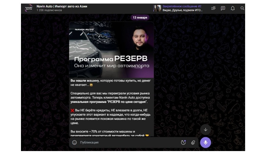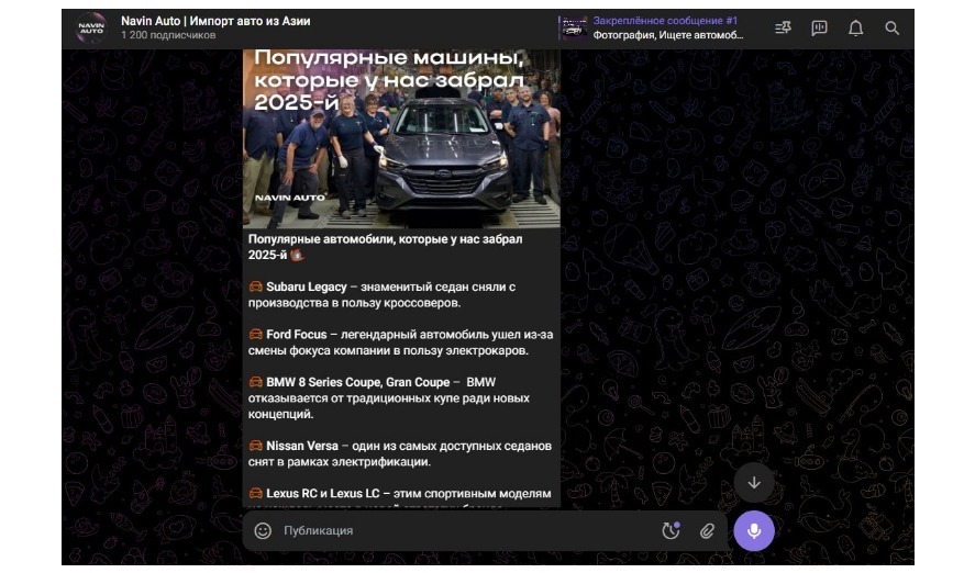 Navin Auto — компания, которая с 2020 года занимается импортом автомобилей из Азии (Китай, Южная Корея, Япония). Имеет 23 офиса по России, предоставляет гарантию и полное сопровождение на всех этапах покупки — от подбора до доставки. К июлю 2025 года у клиента уже был Telegram-канал с 735 подписчиками, но он работал как обычная лента с подборками авто без четкой стратегии.